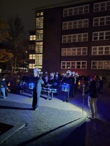 Zurück auf dem Schulhof erwartete alle eine gemütliche Atmosphäre rund um das knisternde Feuer. Das brennende Holz verbreitete Wärme und eine wohltuende Geräuschkulisse, sodass viele Familien noch eine Weile zusammenstanden, sich austauschten und den Abend bei einer Tasse warmem Punsch ausklingen ließen.
