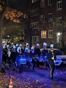 Nachdem der Spielmannszug eingetroffen war, setzte sich die lange Lichterkette in Bewegung. Gemeinsam zogen die Kinder mit ihren Familien durch die umliegenden Straßen. Die bekannten Laternenlieder, gespielt vom Spielmannszug und fröhlich von den Kindern gesungen, sorgten unterwegs für eine besonders festliche Stimmung. Die vielen bunten Laternen schimmerten im Dunkeln und machten den Rundweg zu einem wunderbaren Erlebnis.